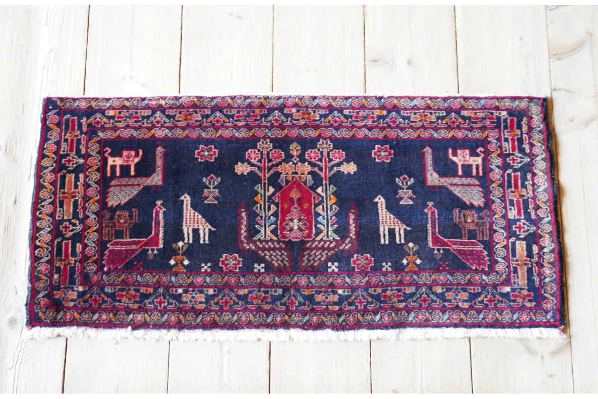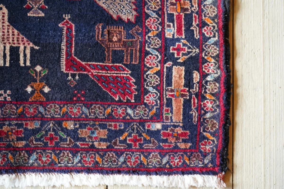“Beludż” dywan tkany ręcznie pochodzi z Iranu. Granatowy kolor tła kontrastuje z czerwonymi i białymi akcentami wzorów: stylizowanymi zwierzętami i motywami roślinnymi typowymi dla dywanów plemiennych.