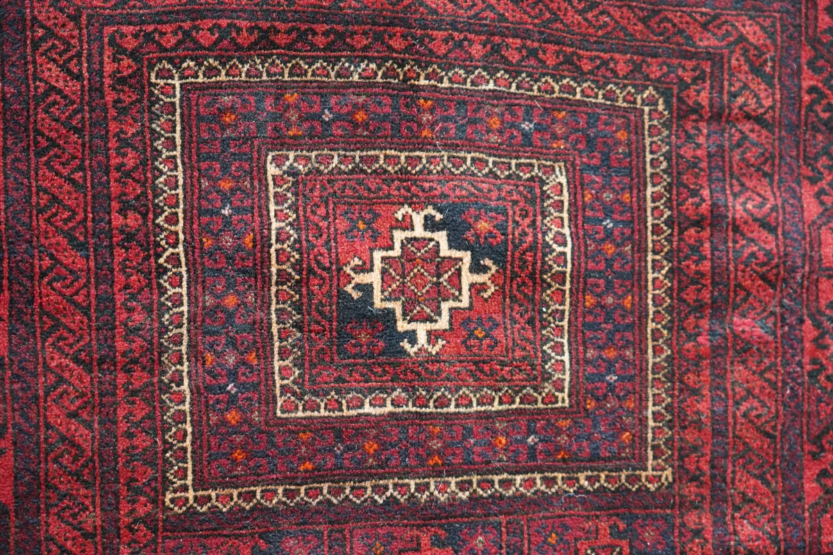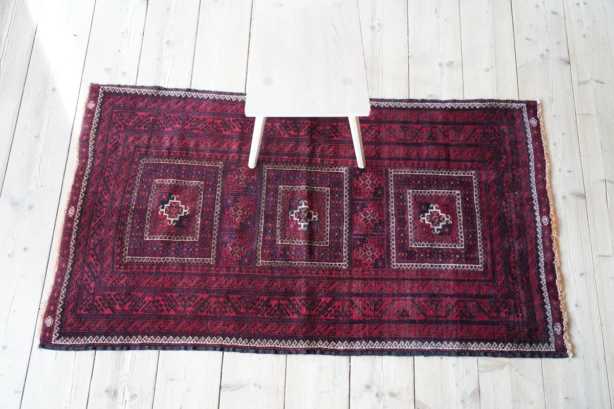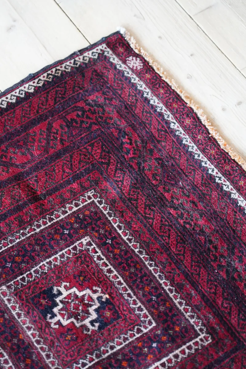 Autentyczny dywan Beludż, ręcznie tkany około 60 lat temu w regionie Beludżystan. Wykonany z naturalnej wełny, z charakterystycznymi geometrycznymi wzorami i głęboką, nasyconą kolorystyką.