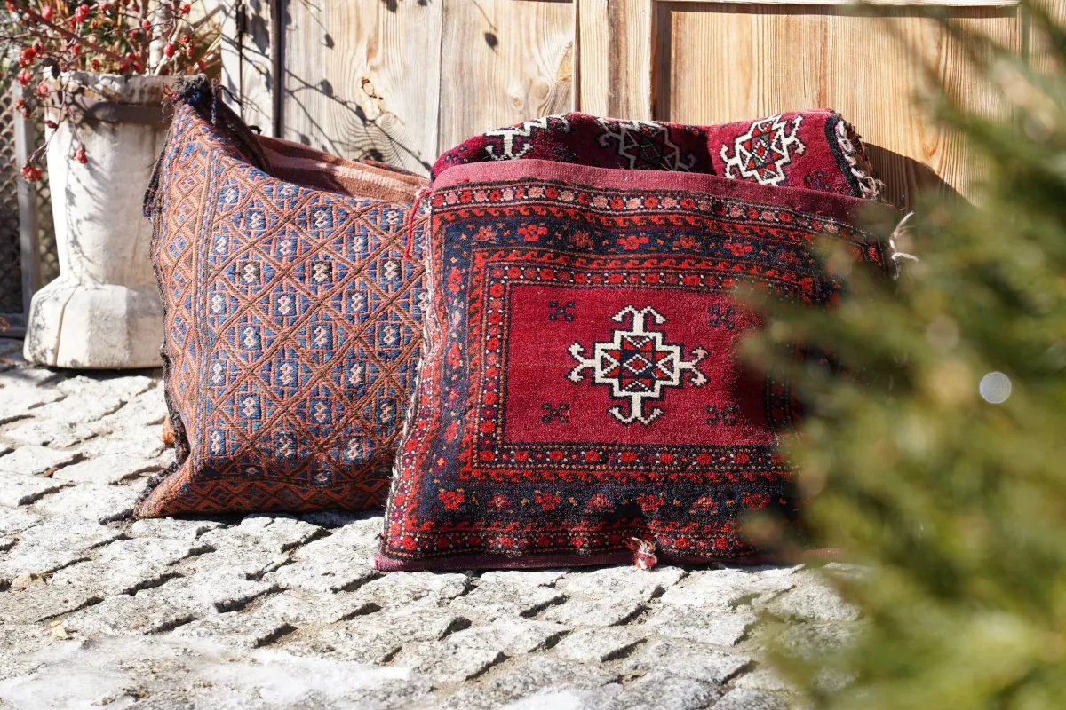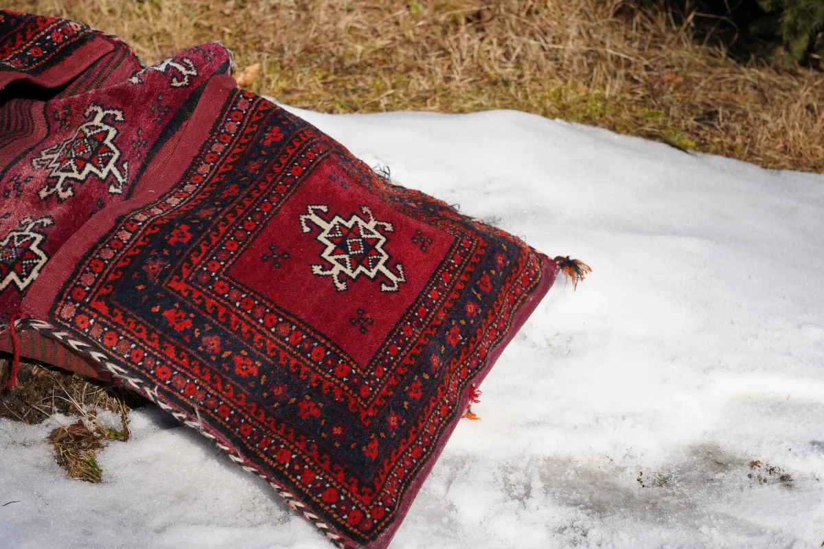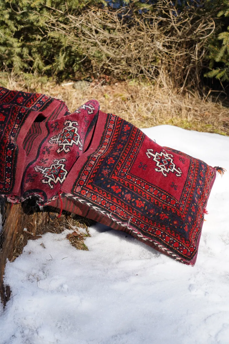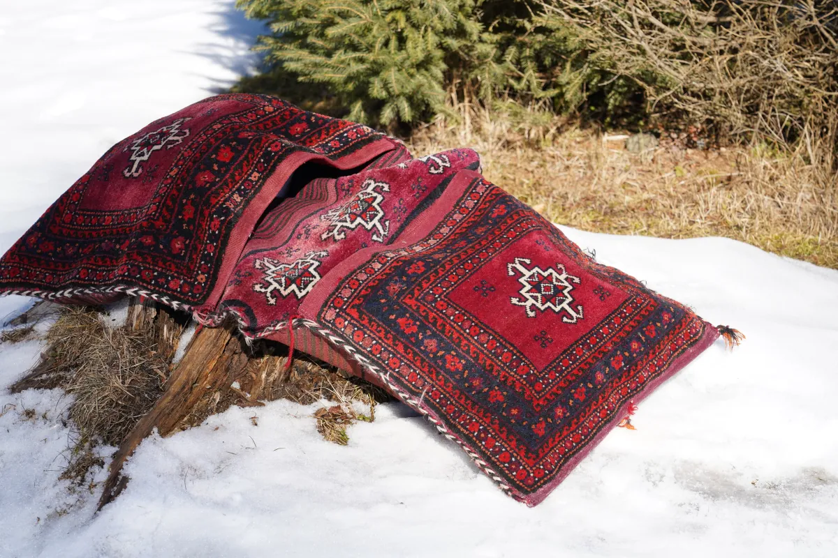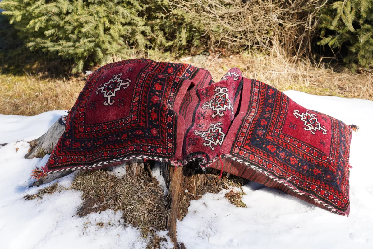Autentyczne sakwy nomadyczne wykonane ręcznie przez lud Beludżów – społeczność o silnych tradycjach plemiennych zamieszkującą pogranicze Iranu i Afganistanu.