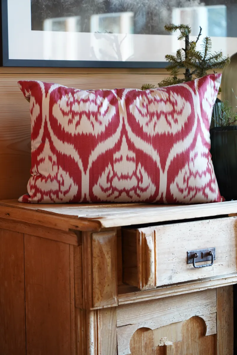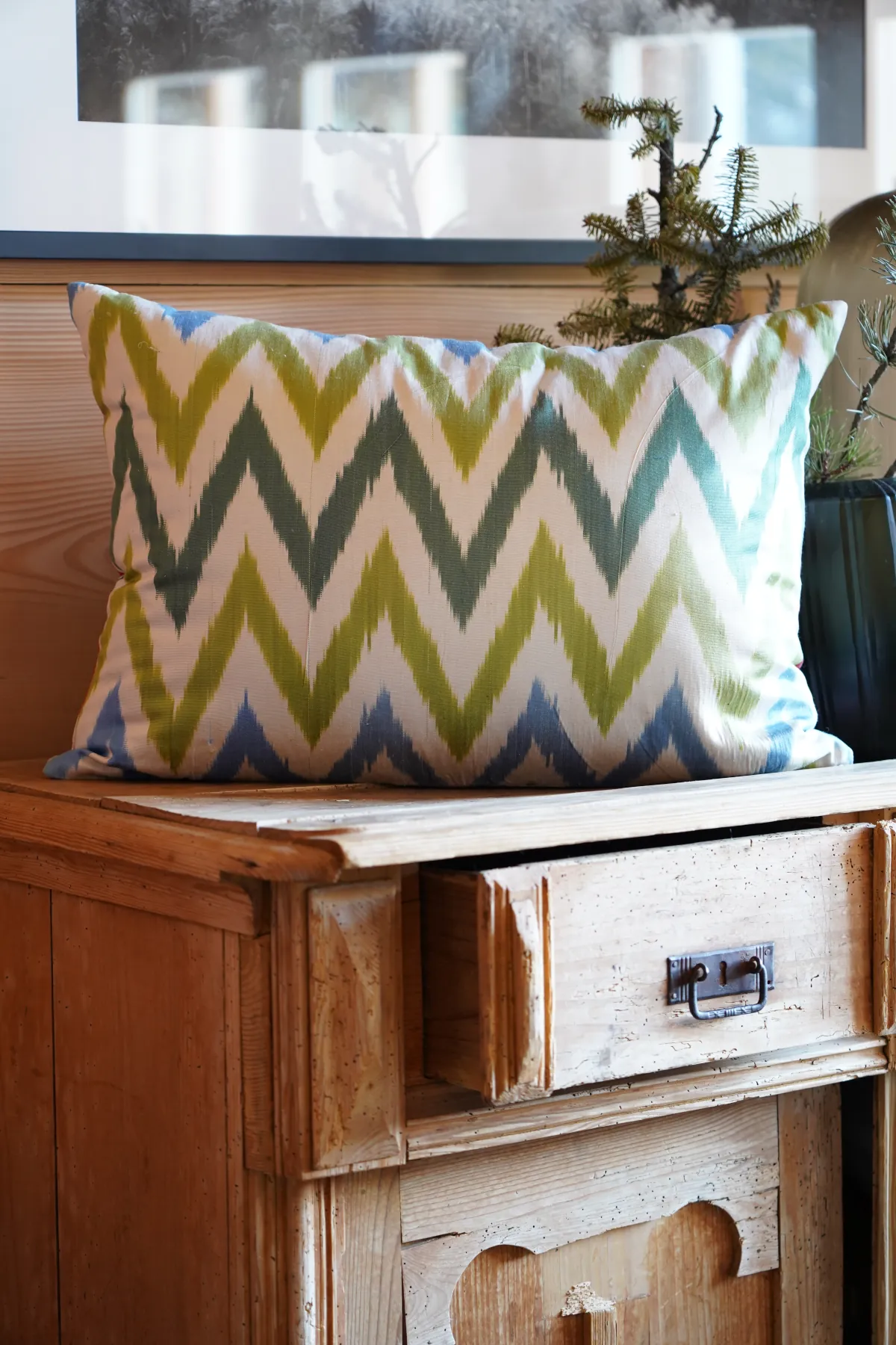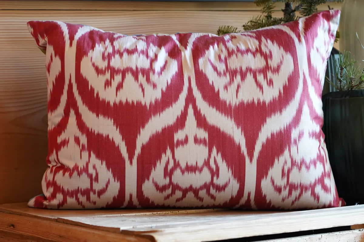 Poduszka “ikatowa” to poduszka uszyta z tkaniny wykonanej w tradycyjnej technice ikat, w której wzór powstaje już na etapie farbowania nici, a nie gotowego materiału. Dlatego wzory mają miękki kontur jak malowane pędzlem czy akwarelą.