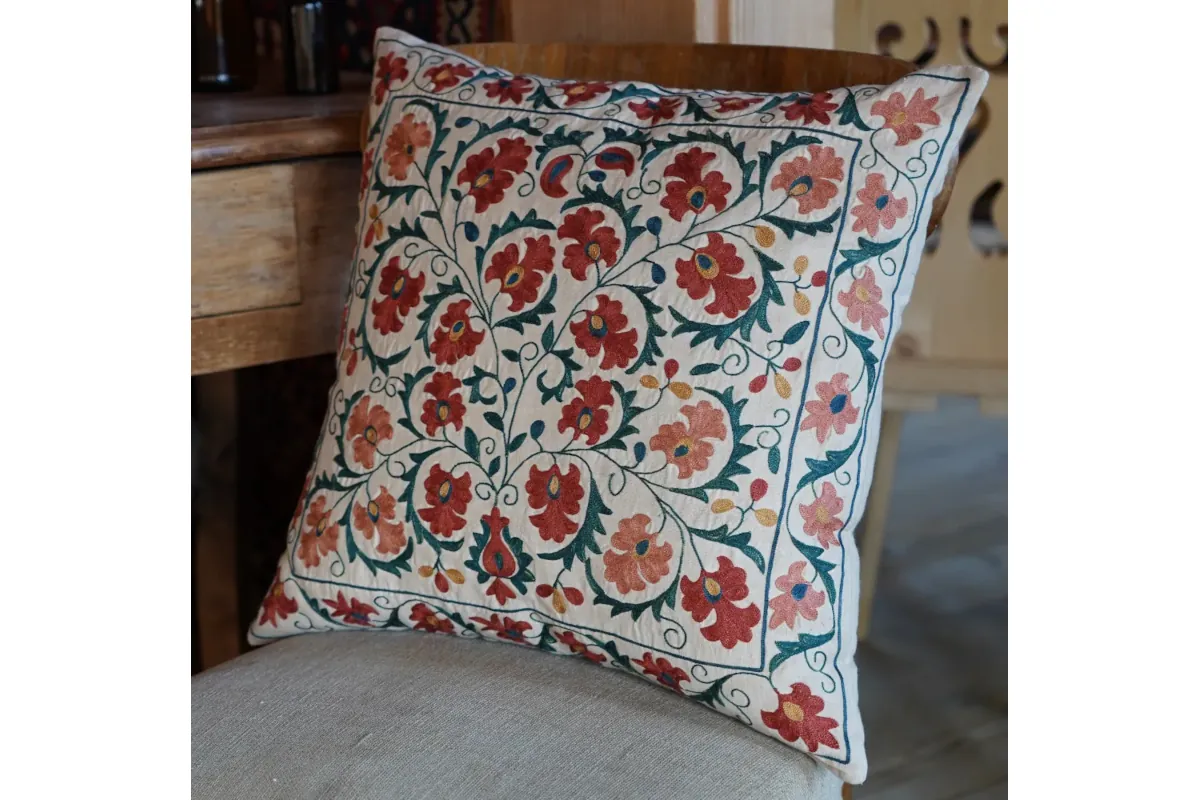 Uzbeckie poduszki z jedwabiu zachwycają tradycyjnymi, kwiatowymi wzorami inspirowanymi kulturą Orientu. To nie tylko dodatki, lecz detale z duszą, które wnoszą do wnętrza spokój, elegancję i odrobinę egzotyki. Poduchy dają ciepły, kolorystyczny akcent na sofie lub fotelu i naturalnie dopełniają przestrzenie w stylu boho etno.