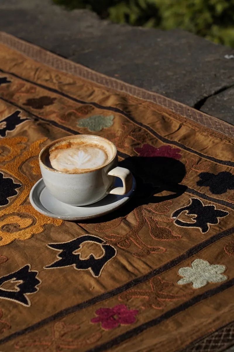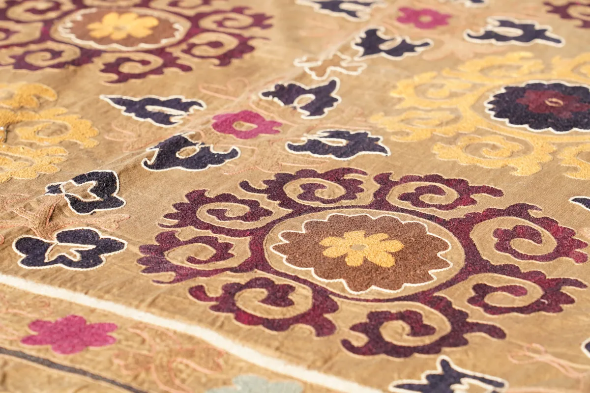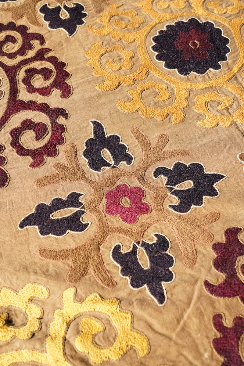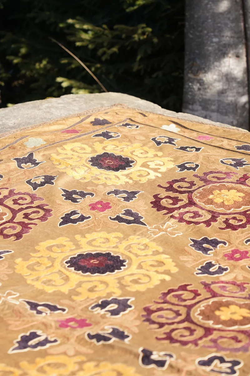 Suzani tworzona jest ręcznie, co sprawia, że jest unikatowa – widoczne detale haftu oraz drobne nieregularności stanowią o jej autentyczności i wartości.